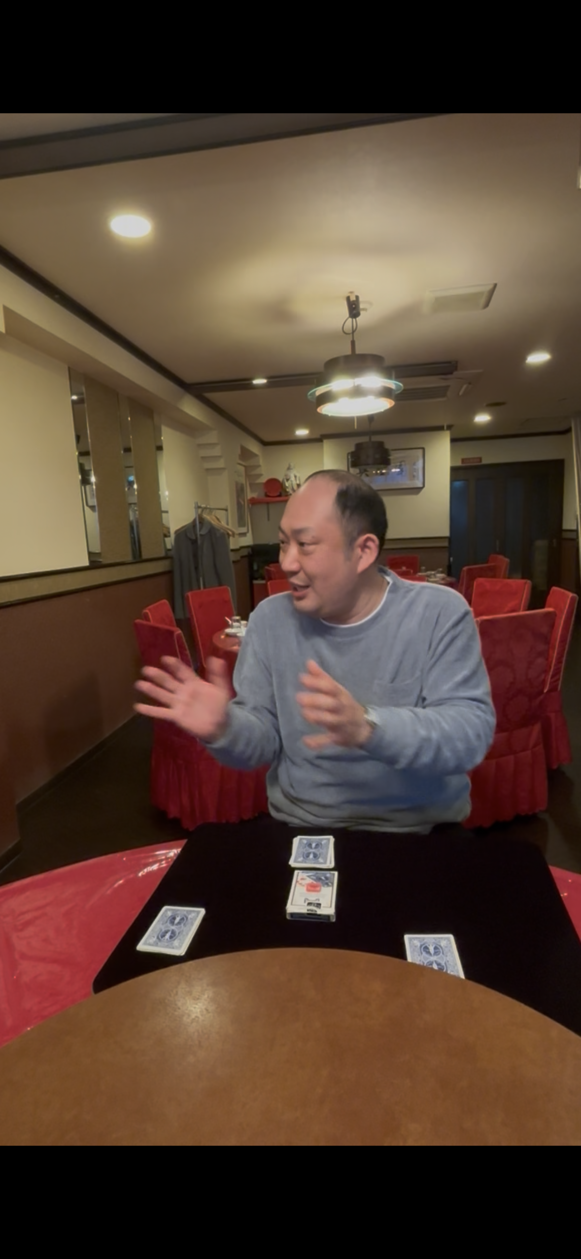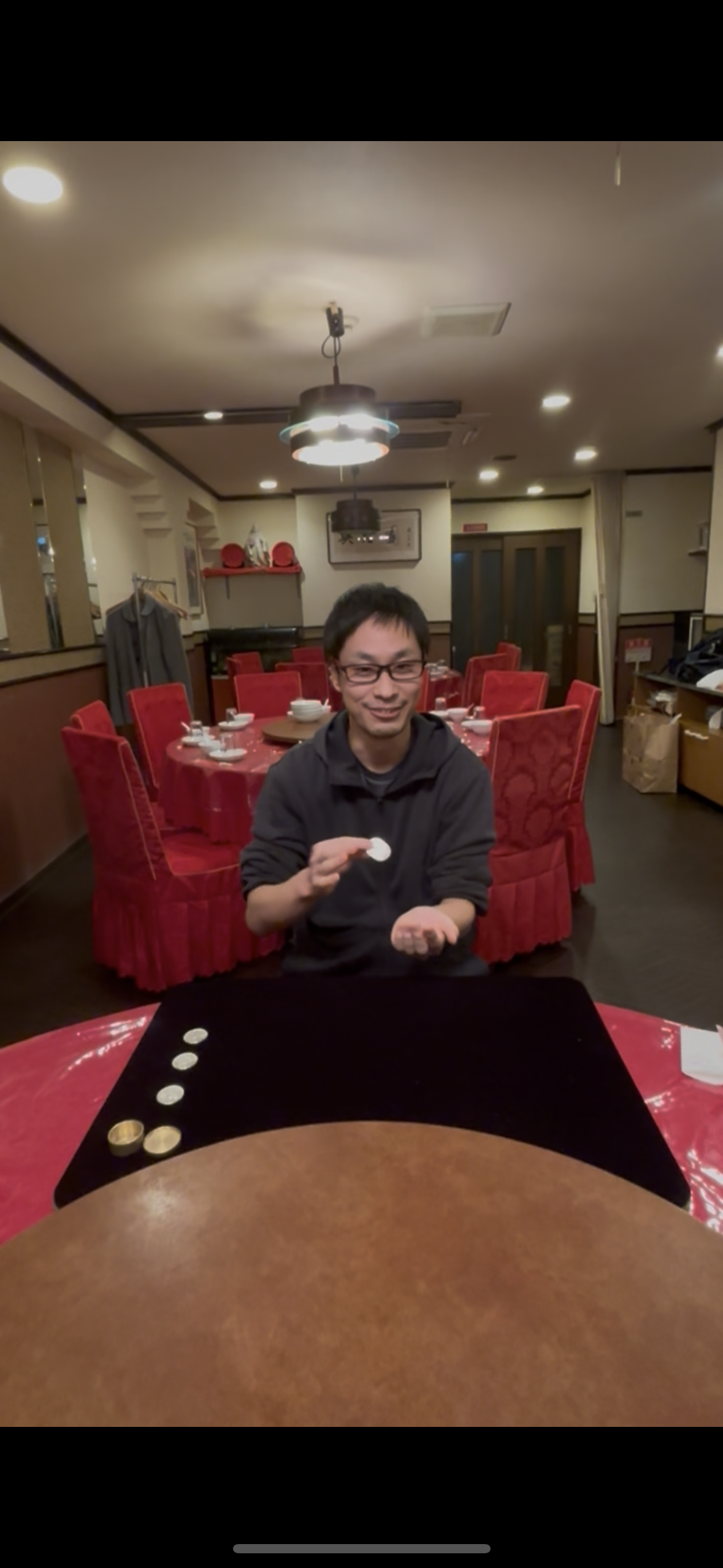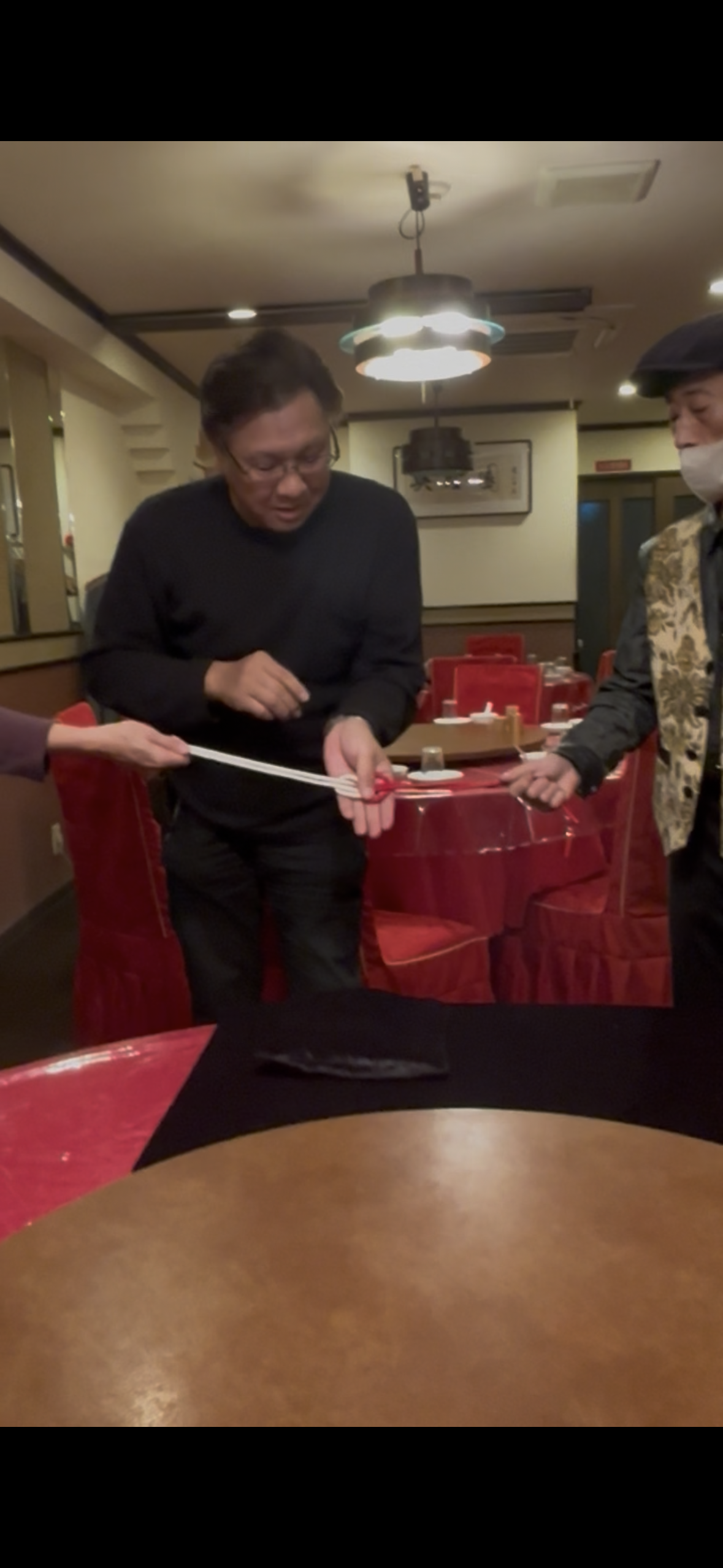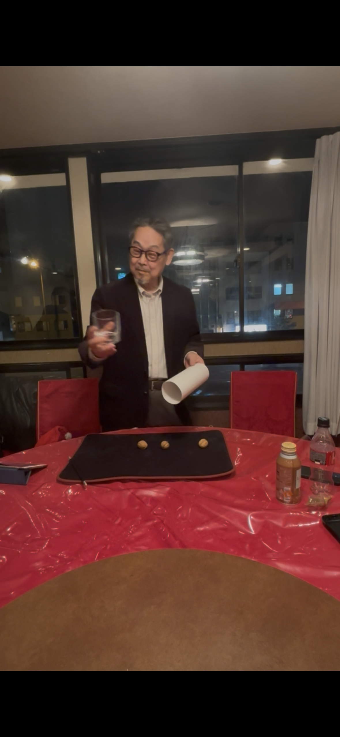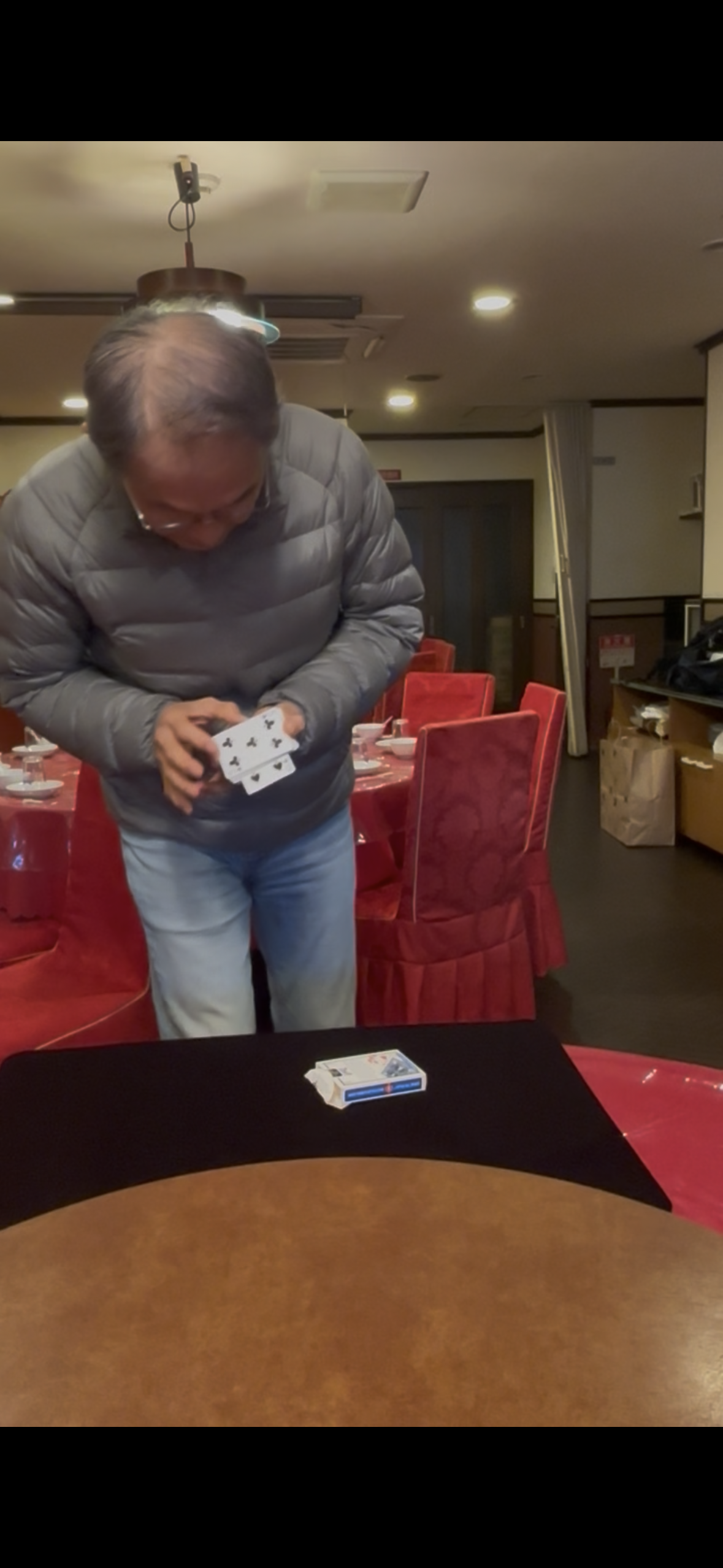 忘年会という事でいつもよりもお酒のペースも時間も少し長く、飲みながら手品をやっています!